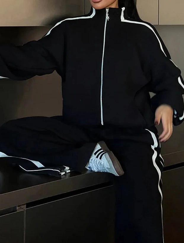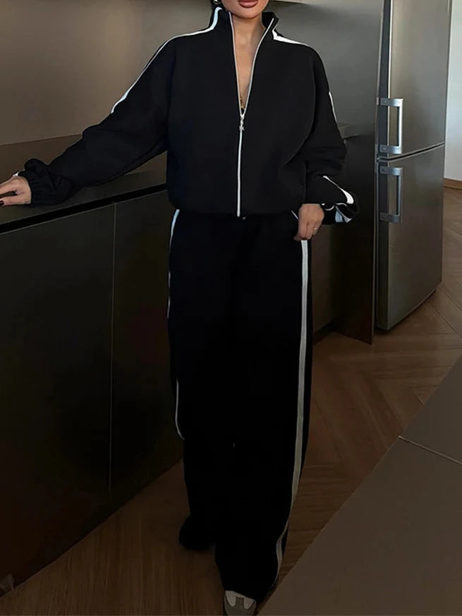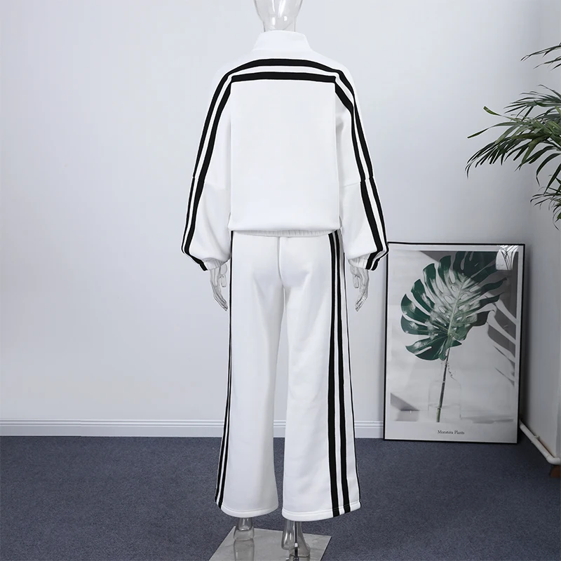 Stripe Contrasted Sweatshirt Pant Set Women Casual Stand Collar Full Sleeve Zippers Sport Coat Wide Leg Trousers 2 Piece Sets